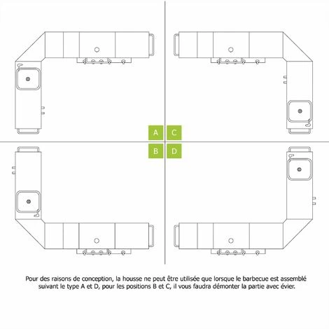 Pour des raisons de conception, la housse ne peut être utilisée que lorsque le barbecue est assemblé suivant le type A et D, pour les positions B et C, il vous faudra démonter la partie avec évier.