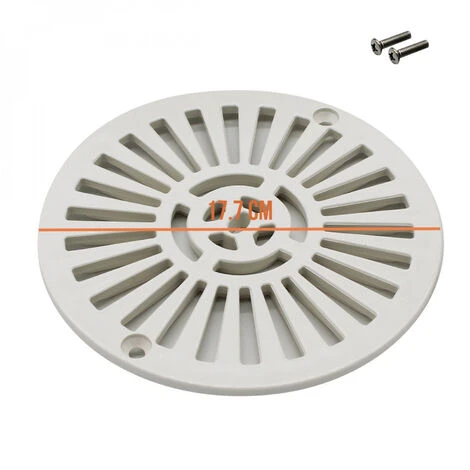 Le diamètre de cette grille bonde de fond pour piscine en béton est de 17.7 cm, son épaisseur de 0.5 cm.