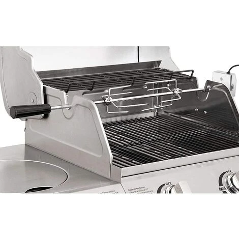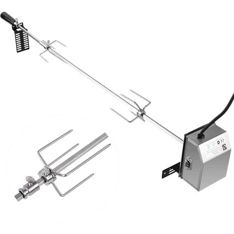 Portée de l’offre: 1x tournebroche 2x pince à viande 1x moteur (220V – 240V) 1x barre d’extension 1x support pour moteur 1x instructions de montage