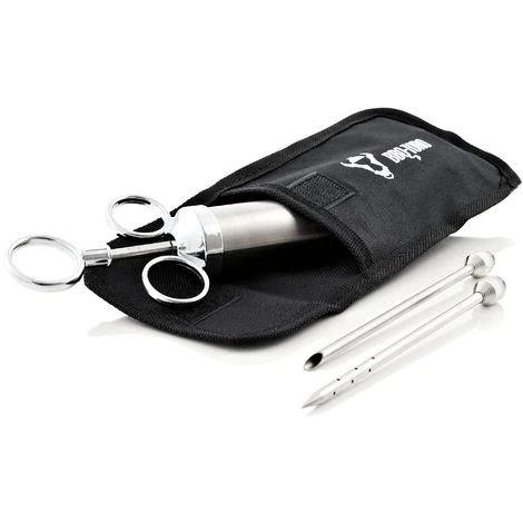 La seringue à mariner la viande est livrée avec 2 aiguilles différentes, qui peuvent être échangées rapidement et facilement avec un bouchon à vis. L’aiguille à trous latéraux est adaptée aux liquides et assure une répartition uniforme de la marinade dans la viande. L’aiguille à gros trou au bout peut injecter des substances plus solides comme de l’ail, des oignons ou des herbes hachées directement dans la viande. La seringue de polymérisation est fournie avec des scellés de rechange et un sac en tissu pratique.