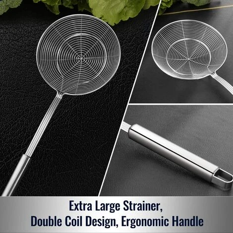 DIMENSIONS : La longueur totale de cette cuillĂšre Ă Ă©cumoire est de 17,7 pouces, dont le bol mesure 7 pouces de diamĂštre et 2 pouces de profondeur avec les fentes correctement proportionnĂ©es qui permet Ă l’huile de s’Ă©chapper des aliments frits sans les renverser. Ainsi, vous pouvez rapidement prĂ©lever une grande quantitĂ© de nourriture avec juste un peu d’eau ou d’huile en peu de temps, ce qui joue un rĂŽle important dans les frites frites, les beignets, les Ćufs durs, la marmite, les fruits de mer, mĂȘme le nettoyage des fruits et la cuisson de la soupe au poulet.
