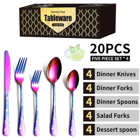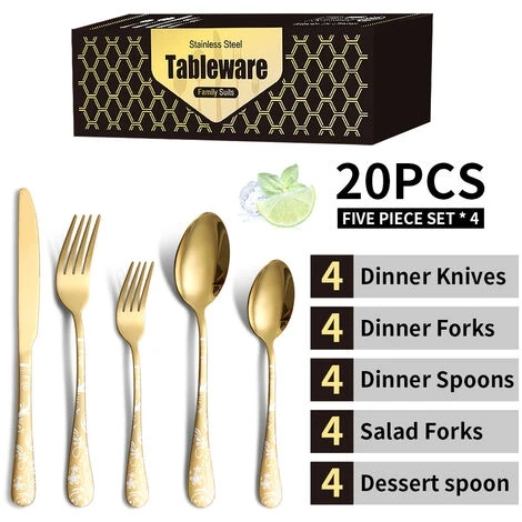 20 Pièces comprennent 4 de chacun, dîner cuillère, dîner fourchette, couteau dîner, cuillère à thé