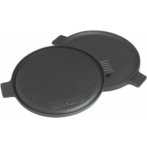 Plaque de cuisson en fonte émaillée avec un coté lisse et un coté strié. Diamètre 35 cmCompatible avec barbecues à charbon ou barbecues à gaz.ATTENTION : IL EST INDISPENSABLE DE PORTER DES GANTS CAR LES POIGNEES SONT CHAUDES.