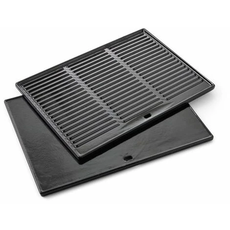 Planche à cuire en fonte émaillée avec une surface rainurée et une surface plate pour cuisiner les ingrédients à la plancha.Préparez encore plus de plats sur votre barbecue avec cette plaque de cuisson universelle de Barbecook.La plaque est pourvue d’un côté lisse et d’un côté strié qui vous permettent de cuire ou griller. Profitez encore plus de votre cuisine extérieure !Convient à tous les barbecues à gaz Stella, Siesta et Quisson de Barbecook.Grande plaque de Long. 43 x larg. 35 cm.Coté lisse et coté strié.Fonte haute qualité.Atteint des températures très élevées.