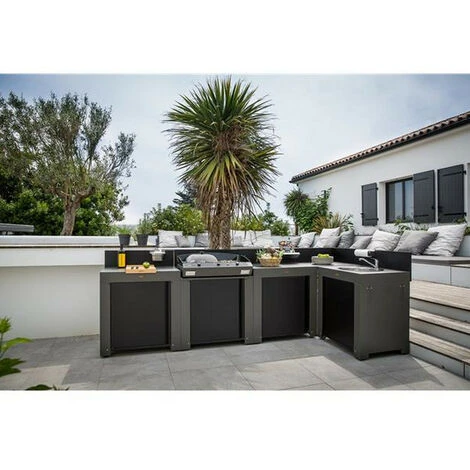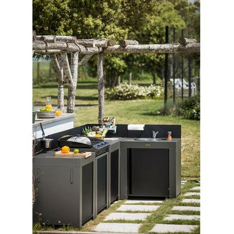 Plateau d’angle Modulo MOD1570 pour plancha Eno. Plateau d’angle gris taupe avec crĂ©dences noires pour fermer l’angle entre 2 meubles Modulo. Cadre en acier galvanisĂ© thermolaquĂ© gris pour rĂ©sister aux intempĂ©ries. CrĂ©dences hautes en acier galvanisĂ© noir.