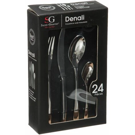 – Kit de 24 pièces contenant 6 couteaux, 6 fourchettes, 6 cuillères et 6 cuillères à café.