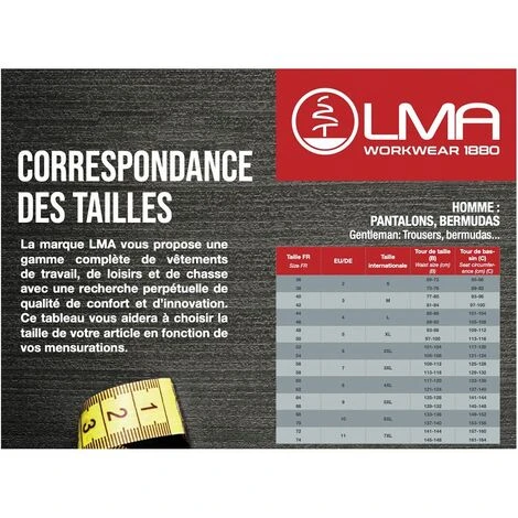 Tablier de jardin avec hauteur réglable par cordon coulissant. 1 grande poche devant. Composition : 65% polyester 35% coton – 245 g/m2. Couleur : NOIR. LMA est la marque phare de la société LEBEURRE SAS. Basée en 1880 à Amiens, la société familiale fut détruite entièrement pendant la guerre. Reconstruite au Hamel, elle s’implanta ensuite à Querrieu en 1972. Spécialisée historiquement dans le velours côtelé et le vêtement de travail, la société propose également à présent des vêtements de loisirs et de chasse. Dès 1983, l’entreprise a débuté la fabrication internationale de certains articles, en partenariat avec le Maghreb. Les premières fabrications en Asie ont été lancées en 1995. A partir de 2002, LEBEURRE SAS a développé son bureau de style, véritable pierre angulaire de la société. En 2009, l’arrivée du directeur commercial a renforcé l’équipe de vente, constituée aujourd’hui de 7 commerciaux exclusifs et 10 VRP. La mise en place depuis 2010 d’un bureau permanent et exclusif en Asie, permet un suivi qualité et le sourcing de nouveaux partenaires.